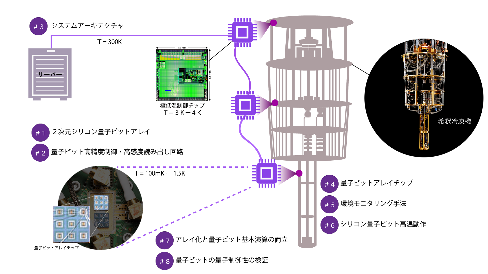 私たちの研究開発プロジェクトは、シリコン電子スピン量子ビットを用いた量子コンピュータの開発、特にシリコン半導体の回路集積化技術を活かした大規模集積シリコン量子コンピュータの開発を担っています。
